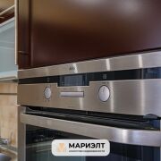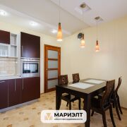 Кухня оборудована необходимой техникой: газовая плита, духовой шкаф, холодильник. Предусмотрено достаточное количество мест для хранения вещей, обеденный стол и стулья.