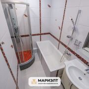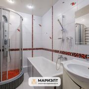 Санузлы облицованы керамической плиткой. В ванной комнате - большой умывальник, ванна и душевая кабина.