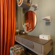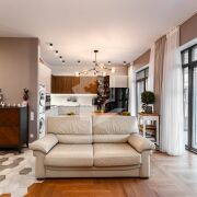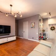 На полу крупноформатная плитка, в жилых комнатах паркетная доска.