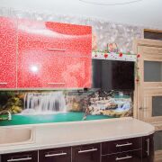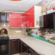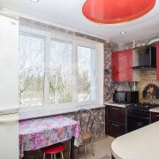 Кухня уютная, с большим окном. Установлен встроенный кухонный гарнитур с каменной столешницей и газовой плитой.