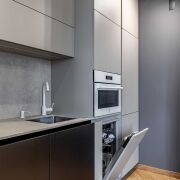 Кухня полностью укомплектована бытовой техникой (посудомоечная машина, варочная панель, вытяжка, холодильник, духовой шкаф).