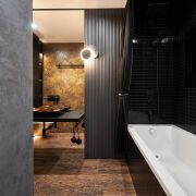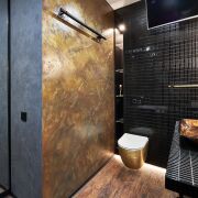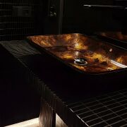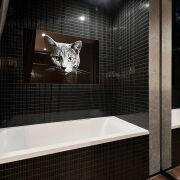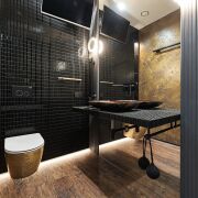 Высококачественная сантехника из Италии, каменная ванна и мозаичные акценты задает определенный тон всему интерьеру.