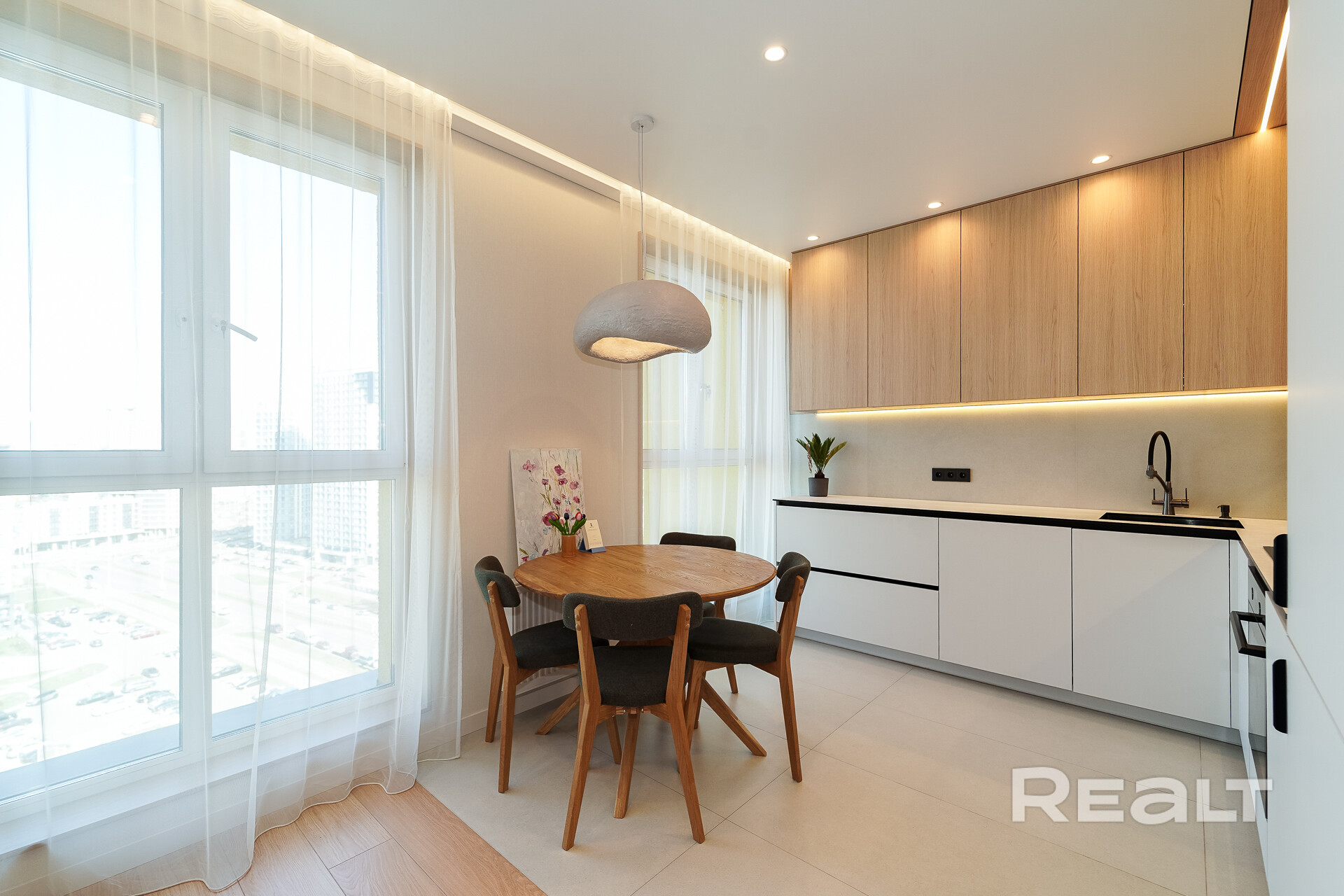 Благодаря высокому этажу и панорамным окнам в пол, квартира наполнена естественным светом.