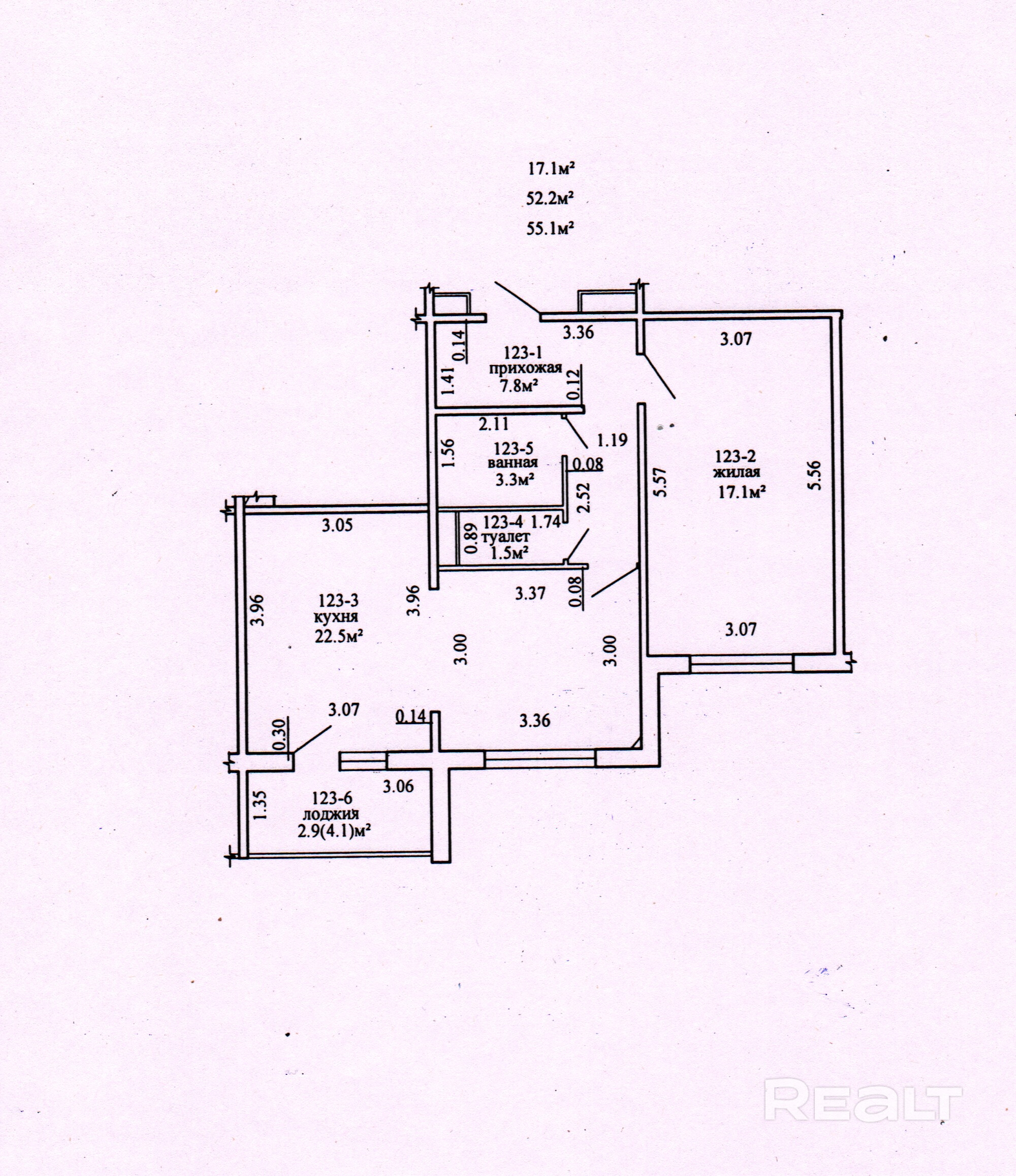 Площадь квартиры указана по СНБ, без учета лоджии общая площадь 52,2 кв.м. Первый высокий этаж.