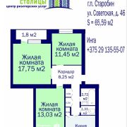 3-комнатная квартира общей площадью 65,6 м кв., жилой площадью – 42,2 м кв. имеет рациональную планировку: три изолированные комнаты площадью 17,8 м кв., 11,5 м кв., 13 м кв., кухню 8,5 м кв., коридор, раздельный санузел, две лоджии, есть подвал и отдельно два сарая во дворе. Квартира находится 3 этаже трехэтажного кирпичного дома номер 46 по ул.Советская.