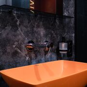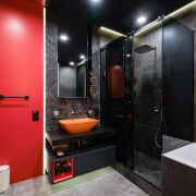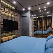 Две гардеробные (6 м2 и 4 м2) органично интегрированы в интерьер: одна скрыта за зеркальной плоскостью, вторая — за графитовым стеклом с подсветкой, создавая эффект галерейного пространства.