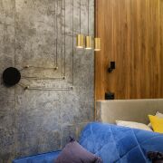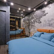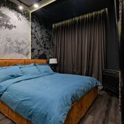 — мастер-спальня (10,8 м2) с премиальной кроватью и ортопедическим матрасом, встроенной системой хранения, кондиционером и ТВ LG; интерьер дополнен художественной росписью и декоративным кирпичом;