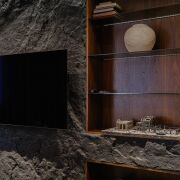 Первый уровень — это эффектная кухня-гостиная площадью 43,8 м2, где гармонично сочетаются эстетика и функциональность. Центральное место занимает зона отдыха с диваном индивидуального изготовления, электрокамином RealFlame и арт-объектом — декоративной скалой ручной работы. Пространство дополнено телевизором LG и системой кондиционирования.