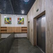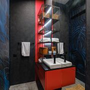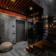 Отделка подчёркивает статус: итальянская штукатурка Oikos, панели и потолочные рейки из американского ореха, дизайнерские радиаторы Zehnder Charleston (Германия). Напольное покрытие — испанский керамогранит Ibero с системой тёплого пола Nexans (Норвегия).