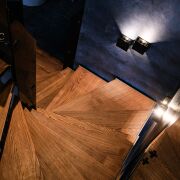 Архитектурная доминанта квартиры — выразительная лестница: стальной каркас, ограждение из закалённого стекла графитового оттенка и ступени из массива ясеня.
