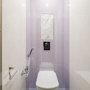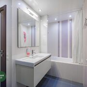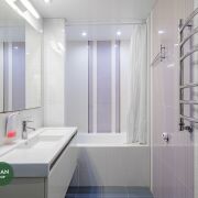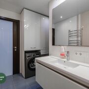 Совмещенный санузел оформлен в современном стиле и полностью готов к использованию. Светлая плитка, качественная сантехника, удобная тумба с умывальником, зеркало с подсветкой, полотенцесушитель и продуманное размещение стиральной машины делают пространство не только аккуратным, но и практичным для повседневной жизни.