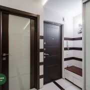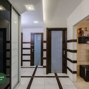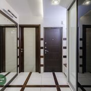 Просторная  прихожая , с большим встроенным шкафом-купе и гардеробной, современной отделкой и удобной входной зоной.
