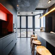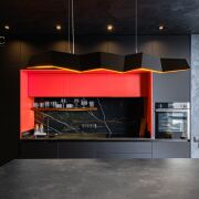 Кухня — это симбиоз дизайна и технологий: встроенная мебель с фасадами и фурнитурой Blum, полный комплект техники премиум-класса — Liebherr, Bosch, AEG, Neff. Японская мойка Omoikiri, измельчитель InSinkErator и многоуровневая система очистки воды обеспечивают максимальный комфорт. Столешницы и барная зона выполнены из итальянского керамогранита Laminam, акцент — барные стулья из массива дуба.