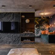 Первый уровень — это эффектная кухня-гостиная площадью 43,8 м2, где гармонично сочетаются эстетика и функциональность. Центральное место занимает зона отдыха с диваном индивидуального изготовления, электрокамином RealFlame и арт-объектом — декоративной скалой ручной работы. Пространство дополнено телевизором LG и системой кондиционирования.