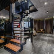 Архитектурная доминанта квартиры — выразительная лестница: стальной каркас, ограждение из закалённого стекла графитового оттенка и ступени из массива ясеня.