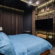 — мастер-спальня (10,8 м2) с премиальной кроватью и ортопедическим матрасом, встроенной системой хранения, кондиционером и ТВ LG; интерьер дополнен художественной росписью и декоративным кирпичом;