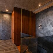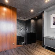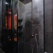Две гардеробные (6 м2 и 4 м2) органично интегрированы в интерьер: одна скрыта за зеркальной плоскостью, вторая — за графитовым стеклом с подсветкой, создавая эффект галерейного пространства.
