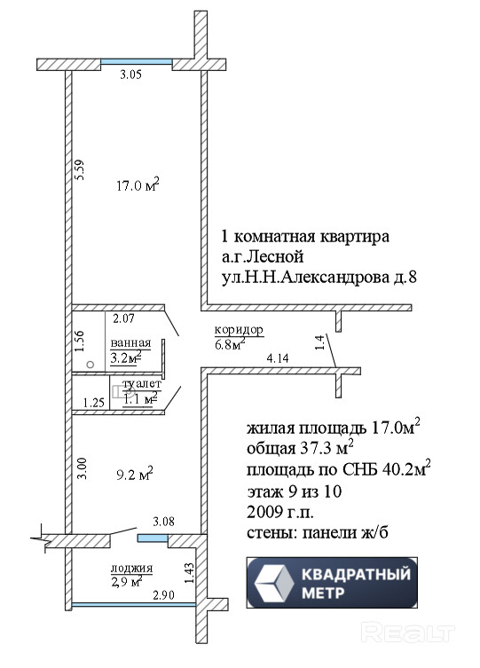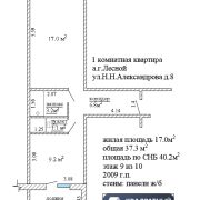 Общая площадь квартиры составляет 37,3м2, площадь по СНБ 40,2, жилая площадь 17,0м2, площадь кухни 9,2м2.