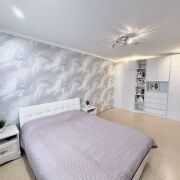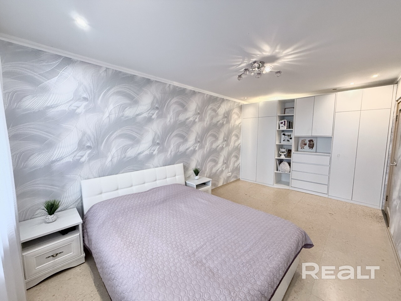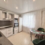 На полу ламинат во всей квартире. Потолки натяжные с различными зонами освещения.