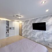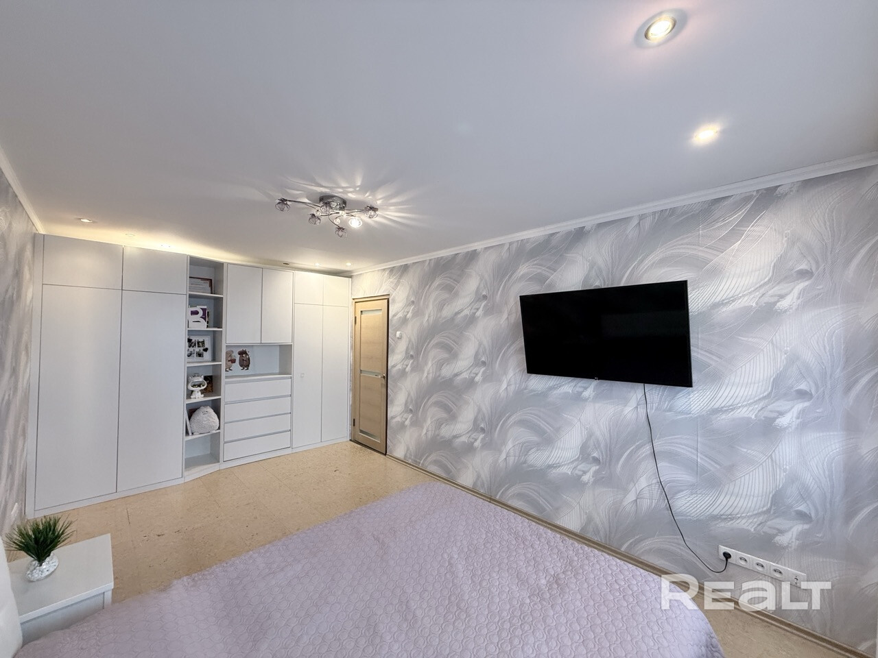 В жилой комнате есть встроенный шкаф, который был сделан под заказ на всю ширину комнаты.