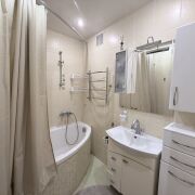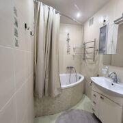 Санузел и ванная комната облицованы плиткой. Установлена угловая ванна.