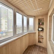 Лоджия застеклена ПВХ стеклопакетами и обшита вагонкой. Вид из окна на зелёную зону и детский сад.