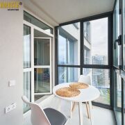 Большие панорамные окна, застекленная лоджия, совмещенный санузел.