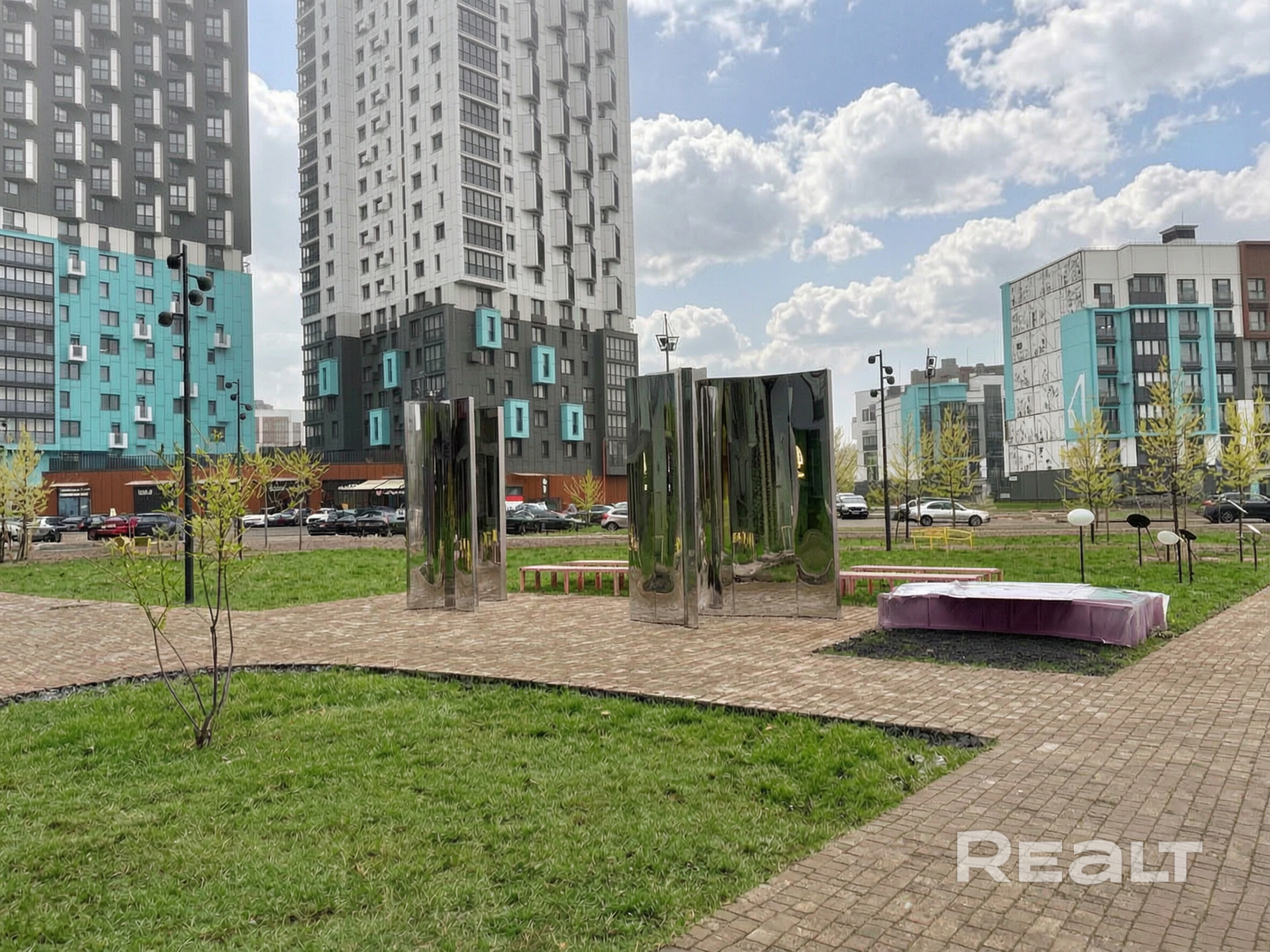 Двор закрытый и безопасный: видеонаблюдение, современная детская площадка. Сразу за домом — большой парк с центральной площадью района, где проходят мероприятия и трансляции матчей на большом экране.