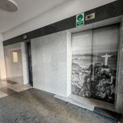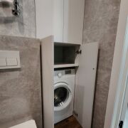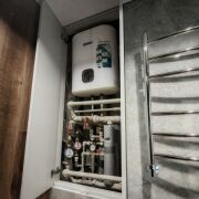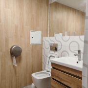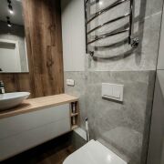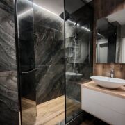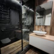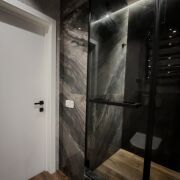 В санузле душевая кабина с подсветкой, керамогранит 1 *1, натяжной потолок, теневой профиль, душевая стойка Hansgrohe с термостатом, инсталяция TECE.