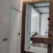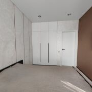В спальне натяжной потолок, теневой профиль, подсветка штор, стены краска, декор штукатурка мокрый шелк, шкаф дсп Eger.
