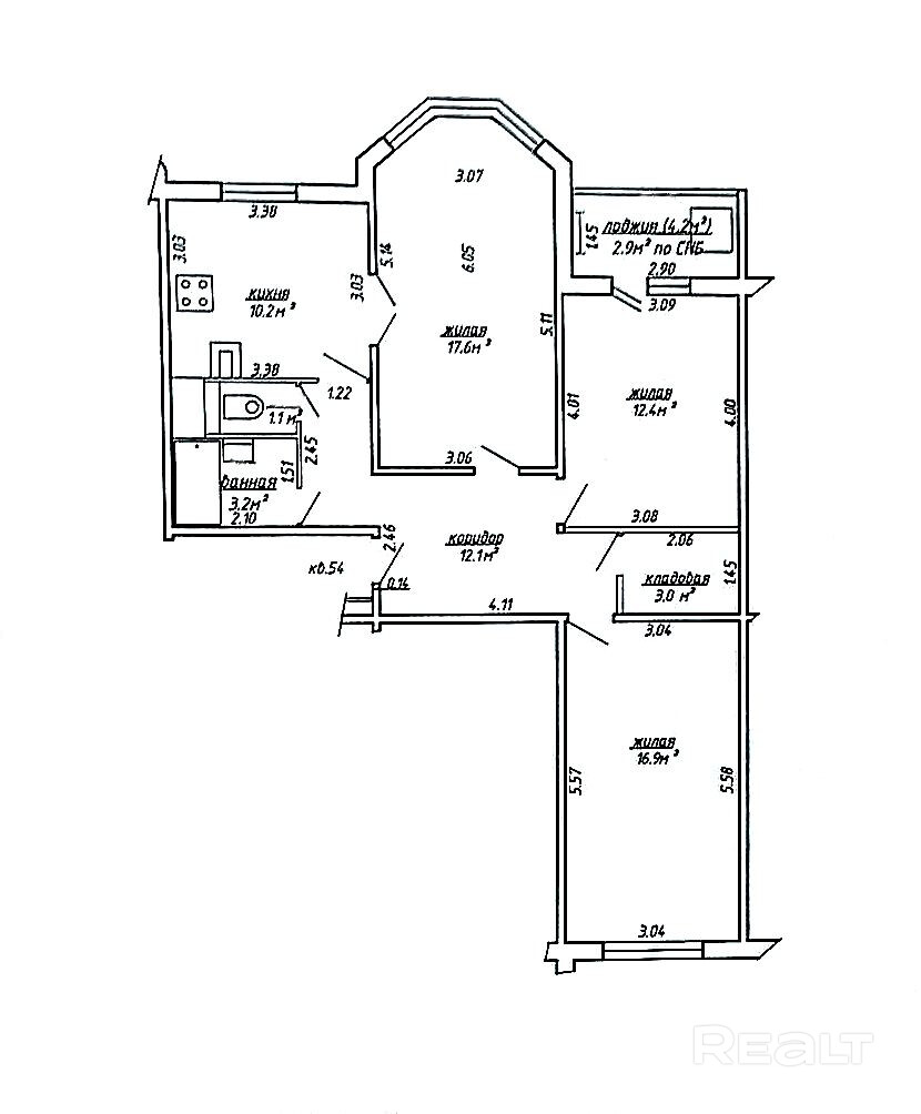 3 изолированные комнаты – 17,6 м2 (с эркерным окном), 12,4 м2 (с выходом на застекленную лоджию), 16,9 м2.