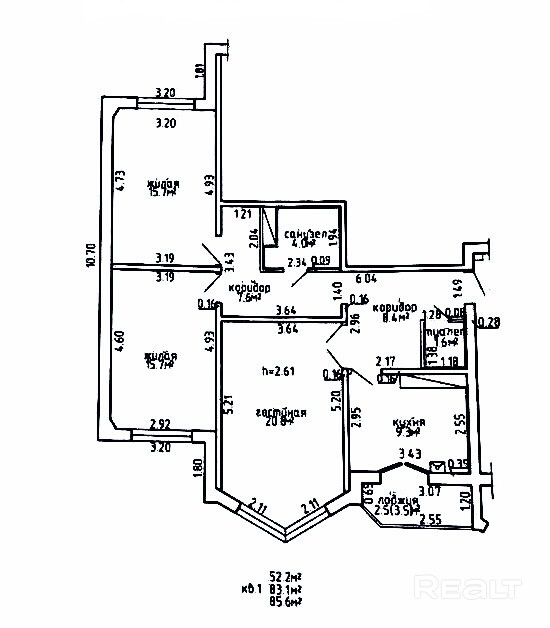 Прекрасная планировка! Общая площадь квартиры по СНБ составляет 85,6 кв.м., жилая 52,2 кв.м., кухня 9,3 кв.м., Высота потолка - 2,61м.