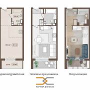 - Свободная планировка включает в себя: гостиную с зоной кухни - 23,1 м2, ванную комнату - 3,8 м2., лоджию - 4,6 м2.