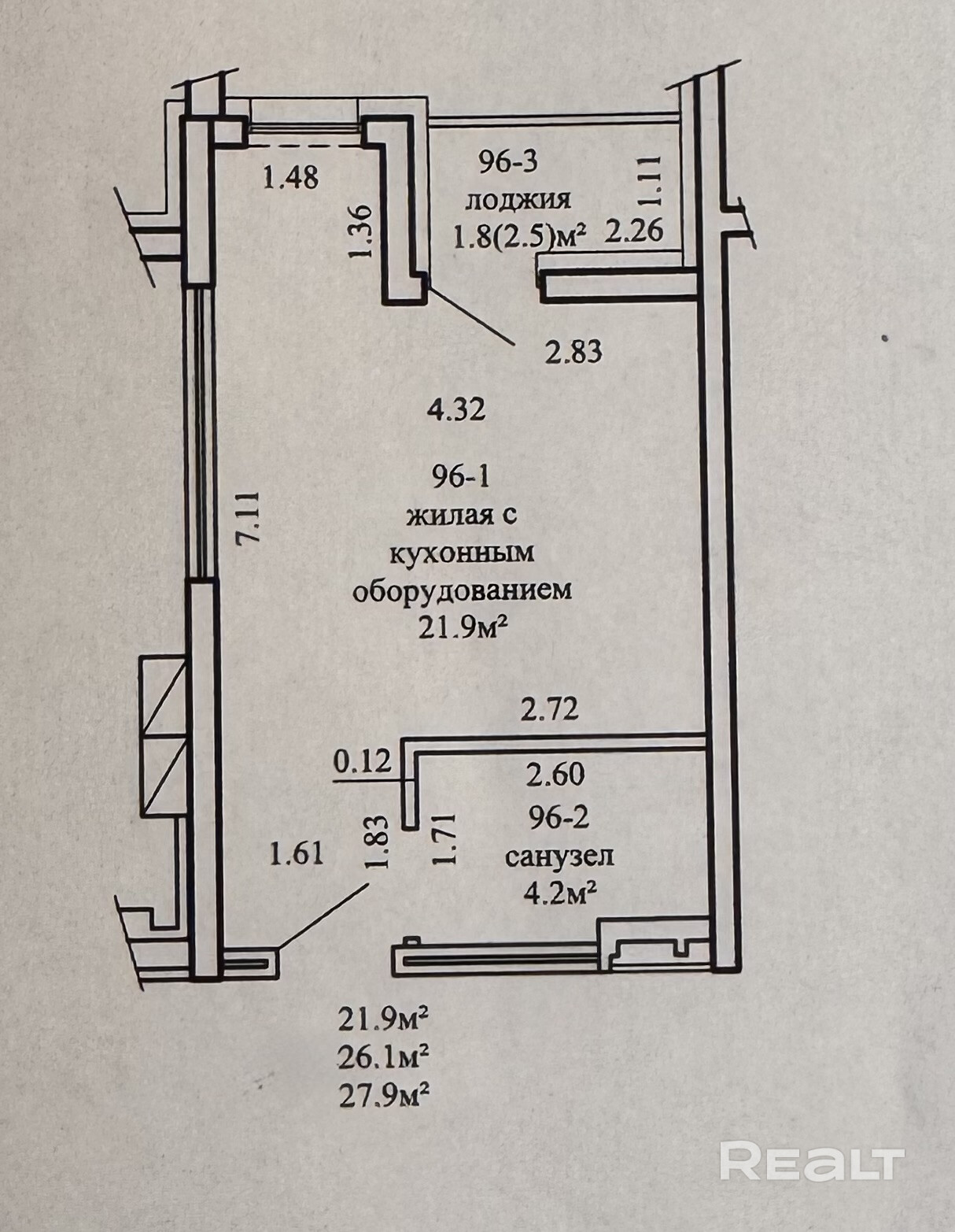 - Общая площадь 26,1 кв.м., по СНБ 27,9кв.м., жилая 21,9 кв.м.