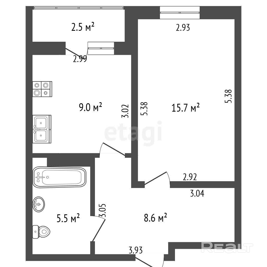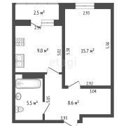 Общая площадь квартиры по СНБ составляет 41,3 м2, из которых 9м2 - кухня и 15,7м2 занимает жилая комната.