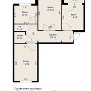 Общая площадь — 75,3 м2 по СНБ. Планировка продумана до мелочей: все комнаты изолированы и правильной формы.
