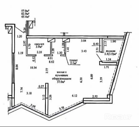 - Площадь по СНБ - 65,4 м2/ общая площадь- 62,9/ жилая- 57,0 м2.
