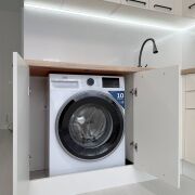Встроенная кухня с доводчиками, подсветкой рабочей зоны и техникой (варочная поверхность, духовой шкаф, вытяжка, холодильник и стиральная машинка).