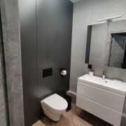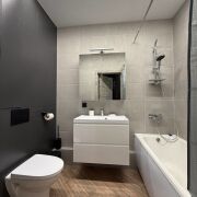 Облицовка плиткой современного дизайна, премиальная сантехника и стильные смесители. Большие панорамные окна в пол.