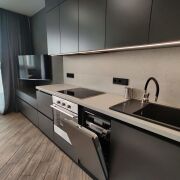 Встроенная кухня с техникой премиум-класса: посудомойка, холодильник, микроволновка, духовой шкаф, варочная панель, вытяжка. Никакой экономии на материалах и фурнитуре.