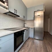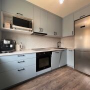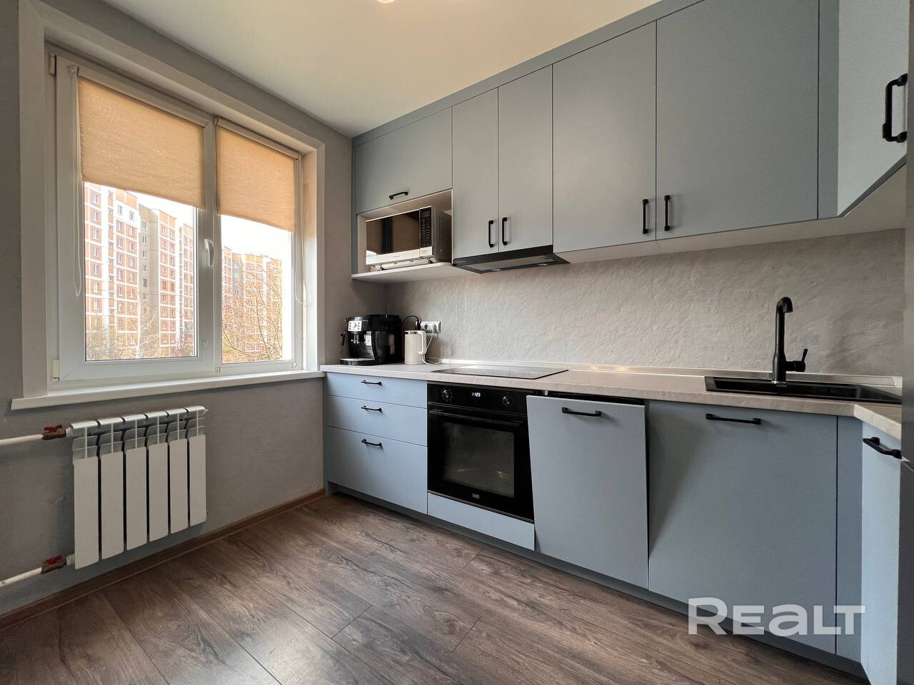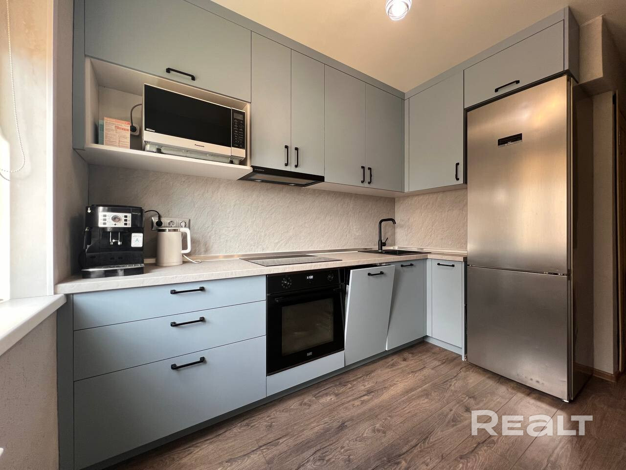 В кухне уже есть все необходимое. Кухонный гарнитур и встроенная техника. Достаточно мест для хранения.