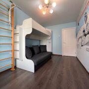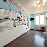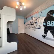 Окна - ПВХ стеклопакеты. Пол – ламинат. Стены – выровнены, окрашены, сделана декоративная штукатурка. Комфортные цвета и интерьерные решения в отделке. В детской комнате на стене граффити ручной работы «Трус не играет в хоккей».