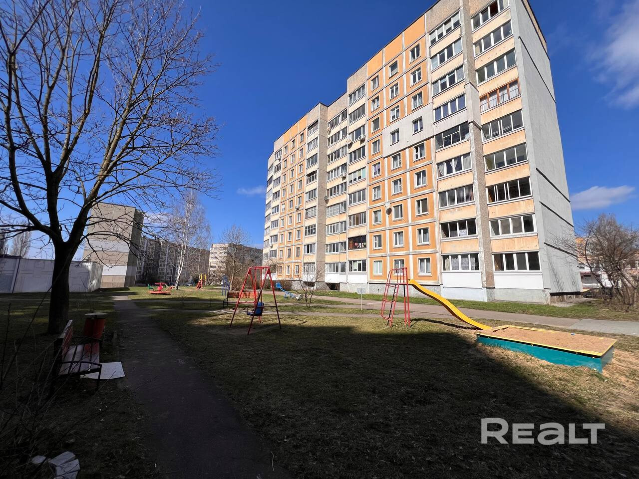 Благоустроенная придомовая территория – детская площадка. Во дворе находится Гимназия №16.