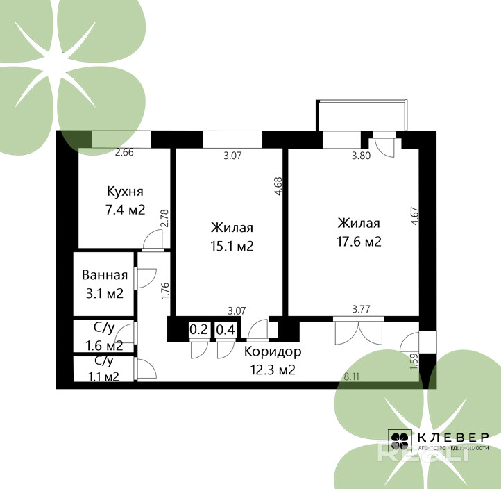 Комнаты: 17.6 м2 и 15.1 м2.