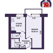 - Квартира расположена на 8 этаже 9-этажного кирпичного дома. Формат — 1-комнатная, общей площадью 33,68 м2, жилая — 16,54 м2. Из жилой комнаты есть выход на застеклённую лоджию, что добавляет дополнительное пространство для отдыха или хранения.