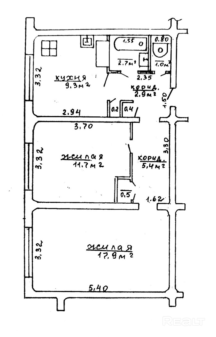 Квартира расположена на высоком первом этаже. Шикарная планировка -кухня 9.3кв.м. и две большие комнаты 17, 9кв.м и 11, 7кв.м. Балкона нет.