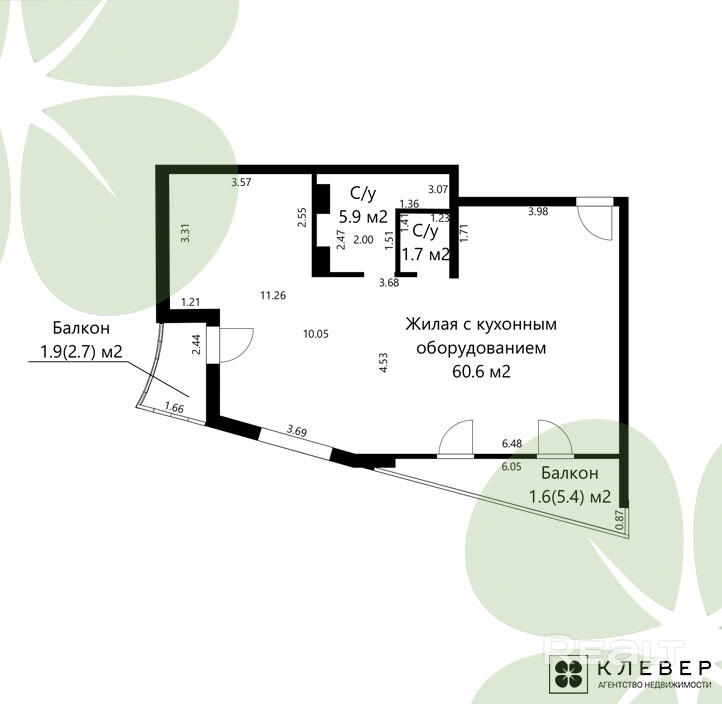Жилая площадь с кухонным оборудованием* – 60.6 м2