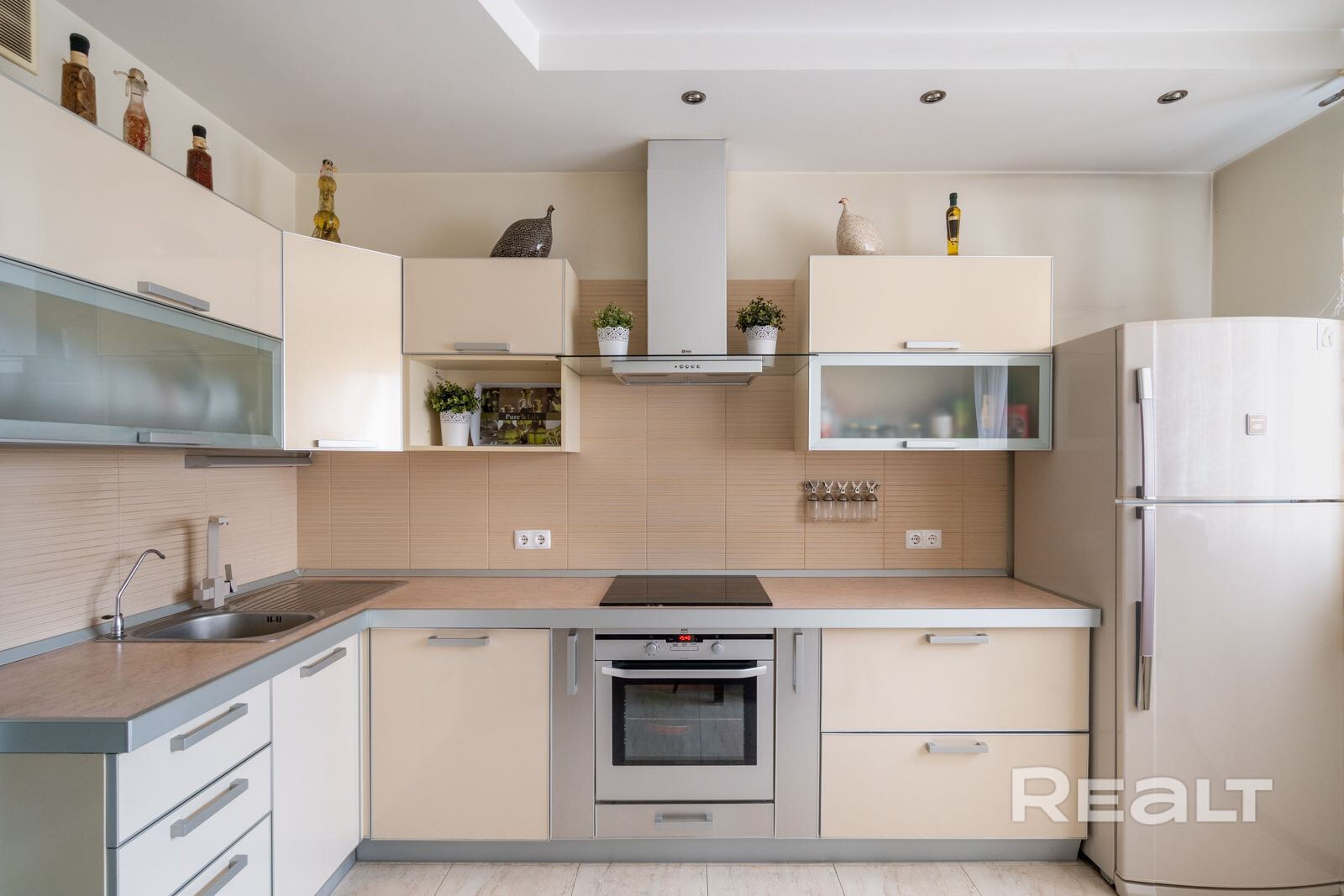 (техника: духовой шкаф AEG; варочная панель AEG; кухонная вытяжка; установлен бойлер; стиральная машина BOSCH