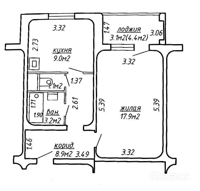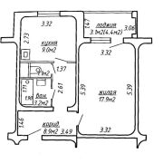 Сочетание общей и жилой площади оптимально (общая СНБ 43,2 кв.м., жилая 17,9 кв. м.), кухня 9 м, раздельный санузел,
