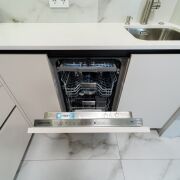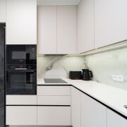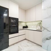 Встроенная, очень вместительная кухня премиум класса оснащена современной техникой от ведущих производителей: холодильник Samsung с дверцами из черного стекла, духовой шкаф Bosch с телескопическими направляющими, микроволновая печь Bosch, индукционная варочная панель 45 см. и мощная вытяжка с обратным клапаном, посудомоечная машина на 14 комплектов и 8 программ. Вся бытовая техника с продлённой гарантией до 5 лет. Тостер Bosch и электрочайник Bosch.